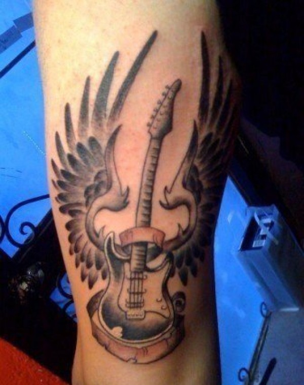 黑色点刺纹身电吉他纹身天使翅膀女性手臂纹身图片