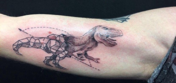 大臂膀上的半写实半几何图形风格恐龙纹身图片
