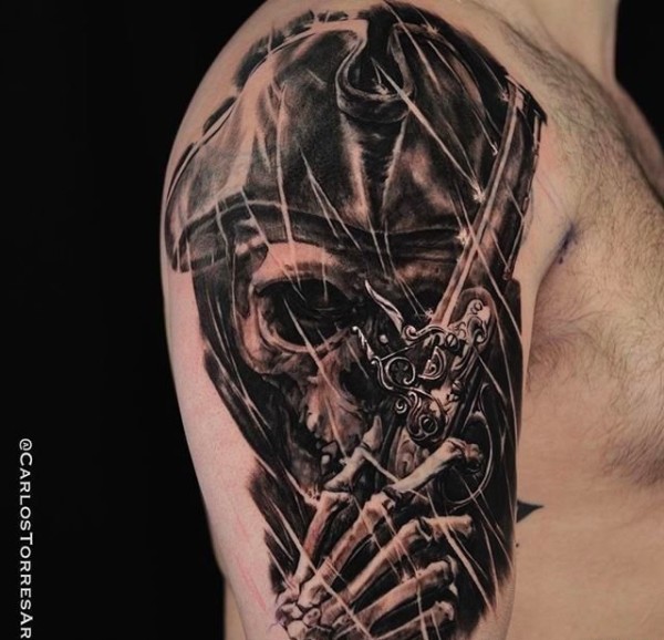 男人大臂黑白彼岸花骷髅_黑白纹身图案大全_纹身图吧