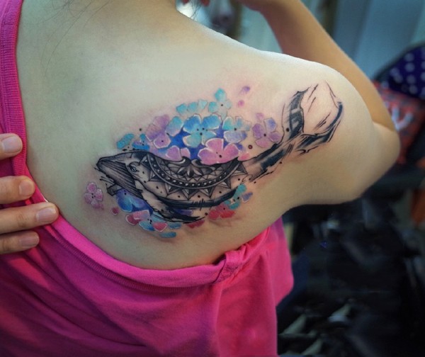 后背唯美鲜花与鲸鱼纹身图案