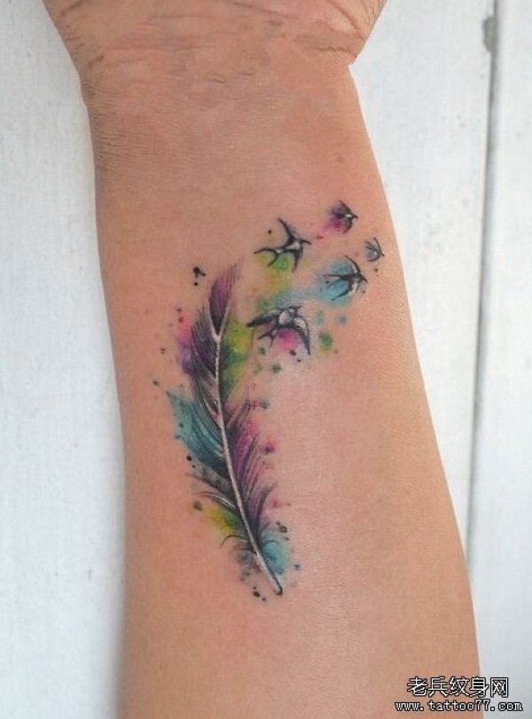 手腕彩色泼墨羽毛燕子纹身图案