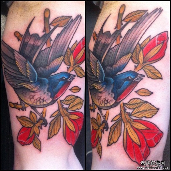 大臂school彩色鸟花卉纹身图案