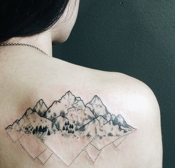 女生背部黑白纹身点刺技巧纹身风景图片
