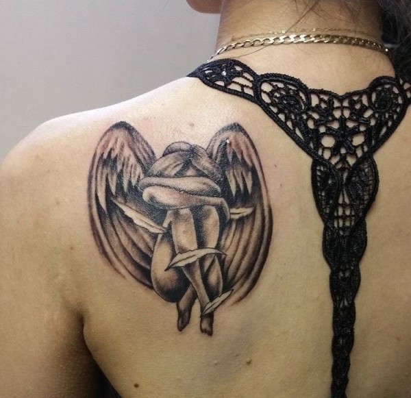 女性黑色线条素描纹身守护天使翅膀纹身图案大全图片