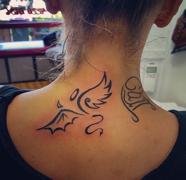 女性黑色线条素描纹身守护天使翅膀纹身图案大全图片