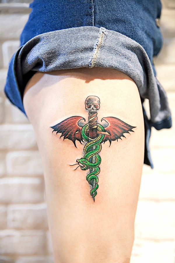 大腿蛇与匕首翅膀骷髅个性纹身图案