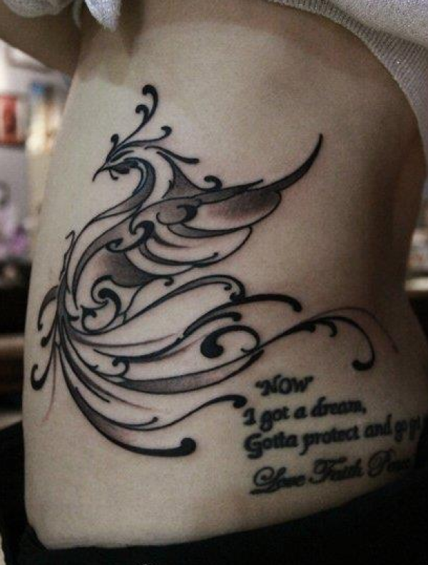 靓女腰部完美新潮的图腾凤凰字母纹身图案