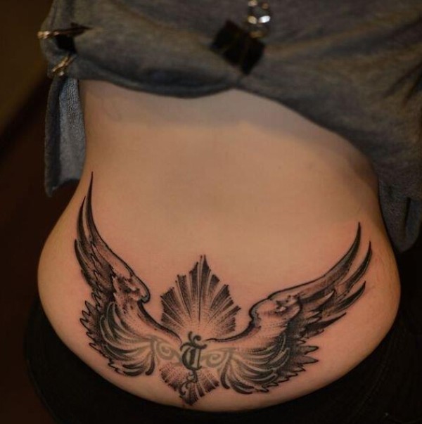 女生后腰纹身黑白灰风格抽象线条纹身图案