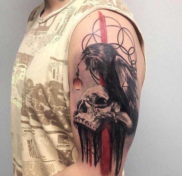 男人大臂黑白彼岸花骷髅_黑白纹身图案大全_纹身图吧