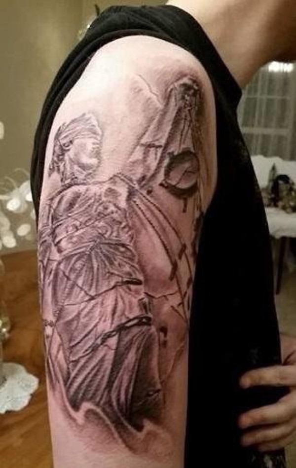 男生手臂上黑白纹身点刺技巧人物肖像纹身图片