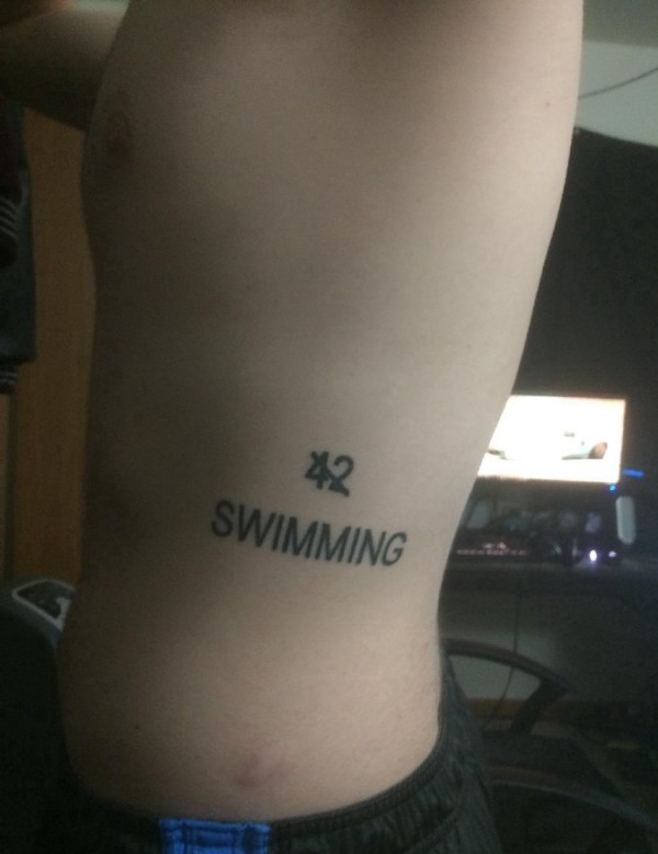 男性腰部黑色简约线条纹身的英文单词和数字字体纹身图片