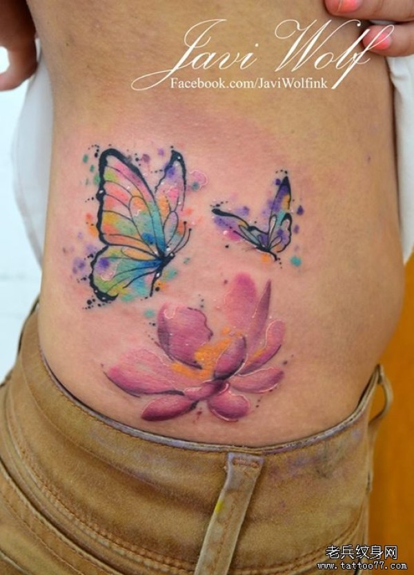 侧腰莲花蝴蝶彩色泼墨纹身图案