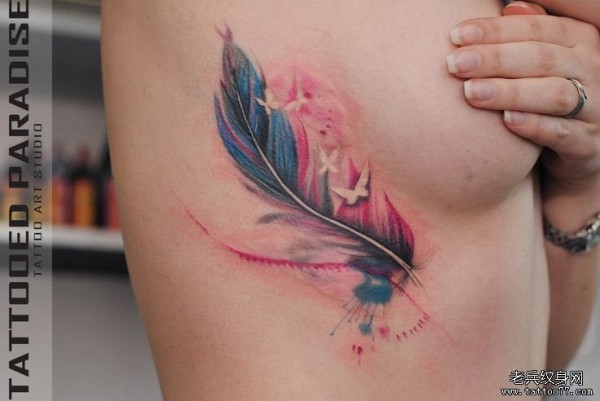 侧肋泼墨彩色羽毛蝴蝶纹身图案