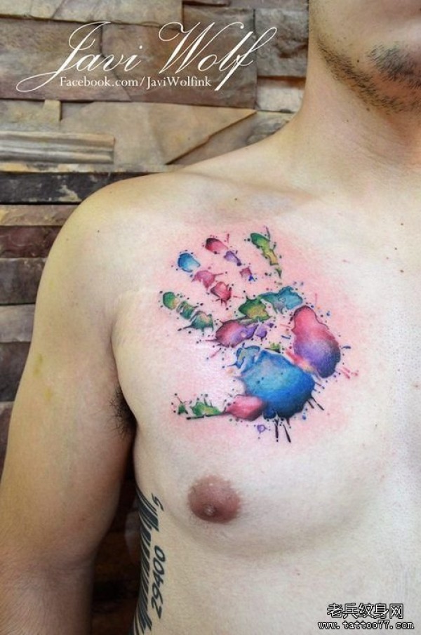 胸口手掌彩色泼墨纹身图案
