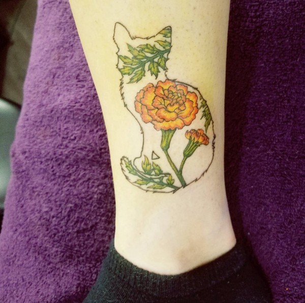 女神腿部猫纹身和文艺花朵纹身图片