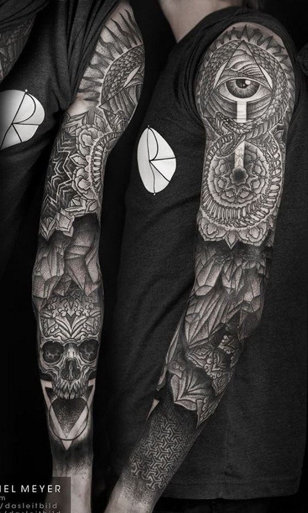 手臂上黑白灰风格点刺纹身图案