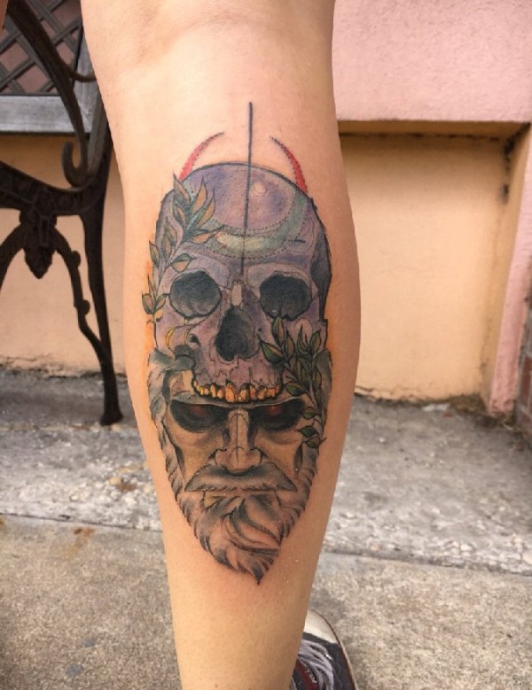 腿部黑白点刺纹身人物肖像纹身和骷髅头纹身图片