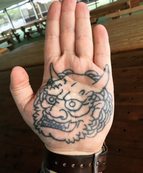 男生手掌上纹身黑白灰风格石狮子纹身图片