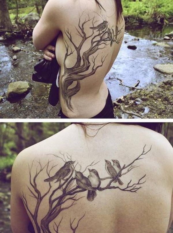 女生后腰纹身黑白灰风格抽象线条纹身图案