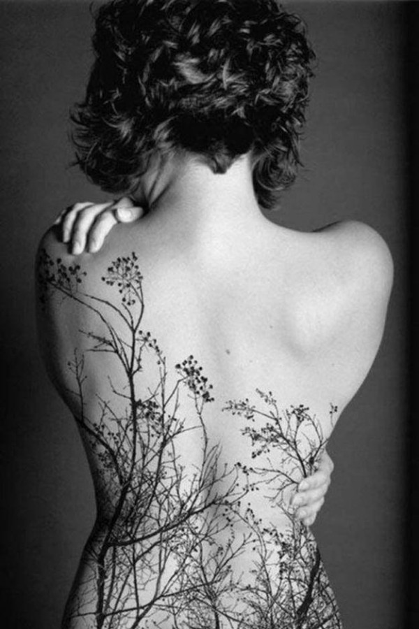 女生后腰纹身黑白灰风格抽象线条纹身图案