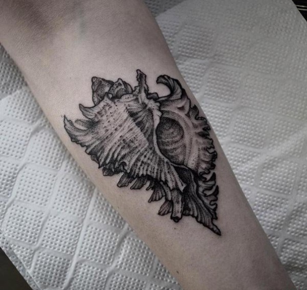 手臂上黑色海螺纹身素描技巧点刺纹身几何纹身图案