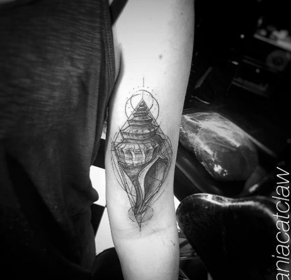 手臂上黑色海螺纹身素描技巧点刺纹身几何纹身图案