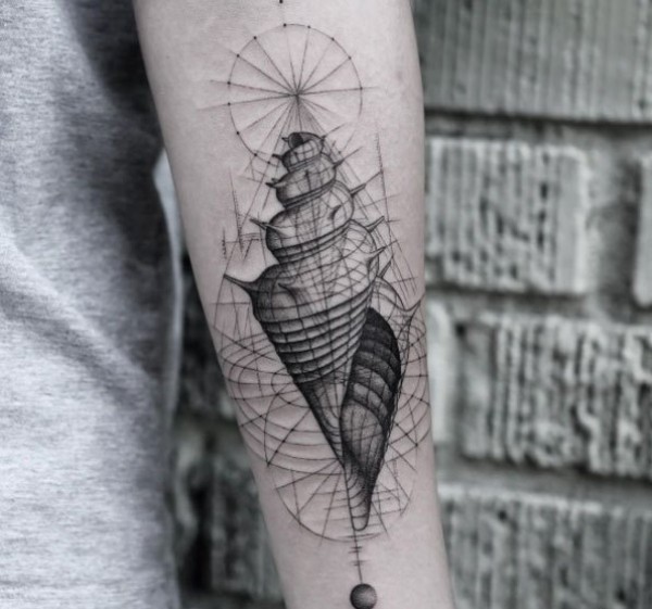 手臂上黑色海螺纹身素描技巧点刺纹身几何纹身图案