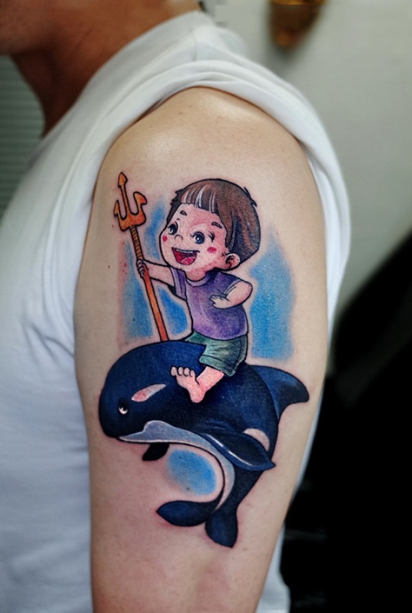手臂小孩鲸鱼卡通彩色纹身图案