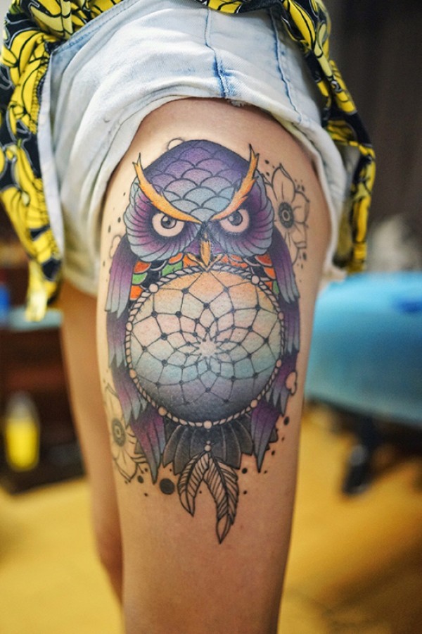 大腿猫头鹰捕梦网彩绘纹身图案