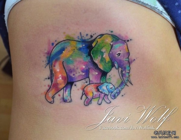 侧腰性感彩色泼墨大象纹身图案