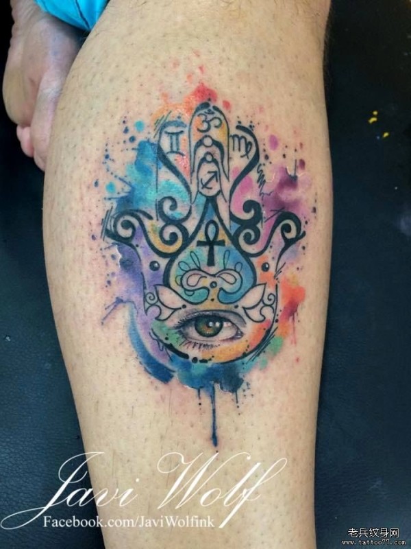 小腿彩色泼墨法蒂玛之手纹身图案