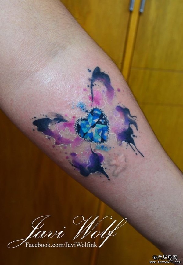 小臂泼墨蝴蝶翅膀与心形钻石彩色纹身图案