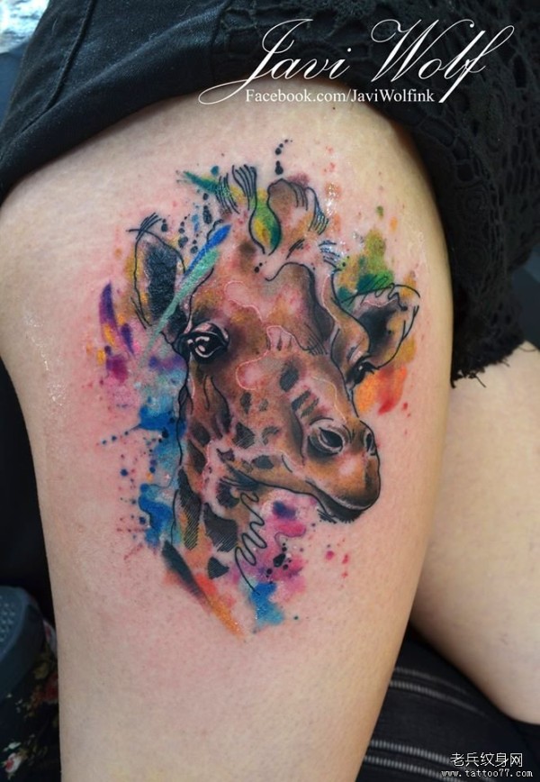 大腿性感彩色泼墨长颈鹿头像纹身图案