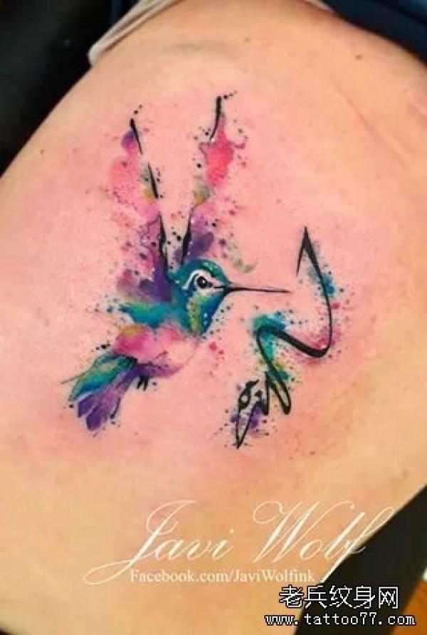 肩部蜂鸟泼墨彩色花卉纹身图案