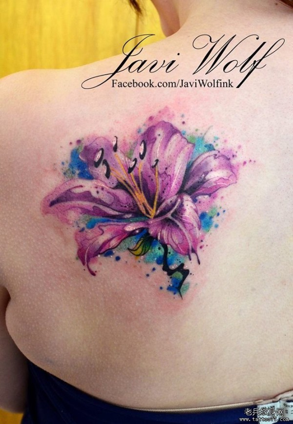 背部紫色百合花彩色泼墨纹身图案