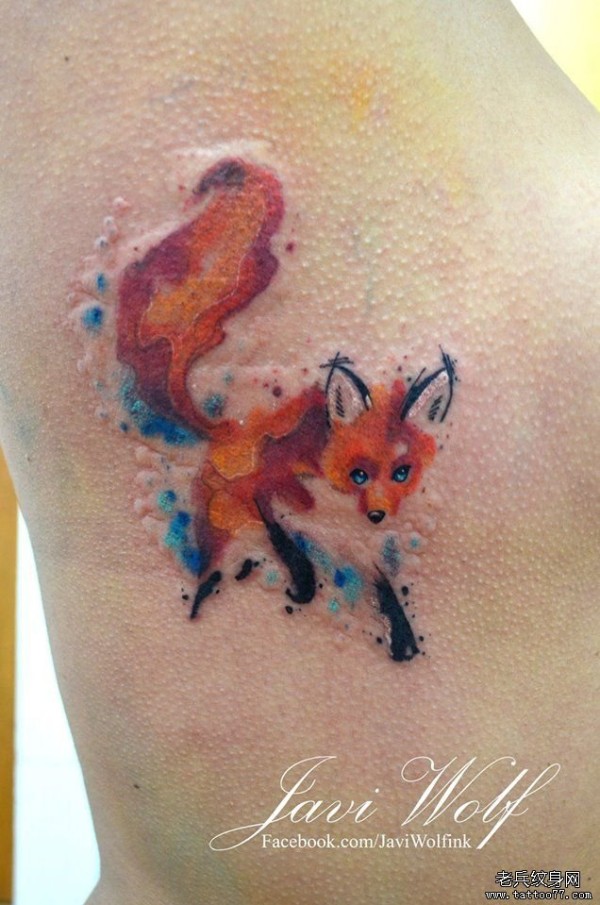 侧腰彩色泼墨狐狸纹身图案