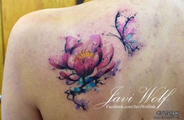 背部莲花蝴蝶水彩泼墨纹身图案