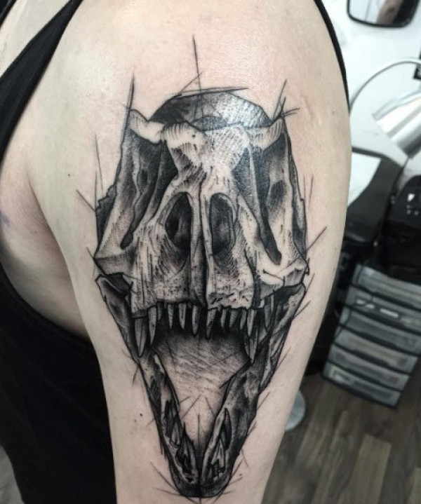 黑色的点刺纹身素描技巧骷髅头纹身动物恐龙纹身图案