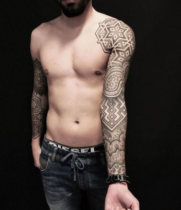 黑色几何线条纹身点刺技巧花臂半甲纹身男士霸气纹身图案