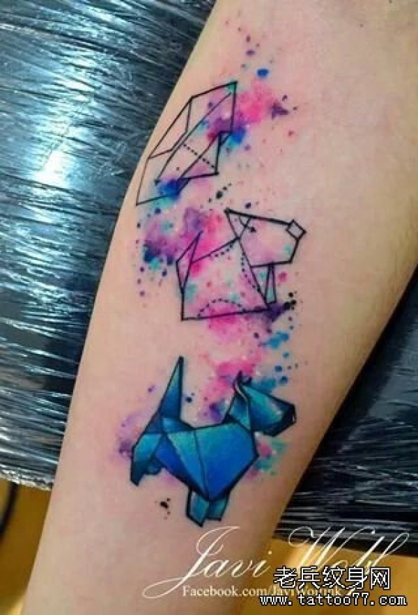 小臂狗几何小清新彩色泼墨纹身图案