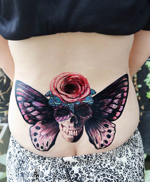 蝴蝶与骷髅玫瑰腰部纹身图案