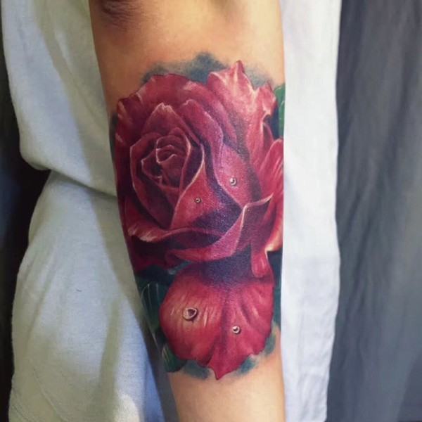 手臂写实娇艳欲滴红玫瑰纹身图案