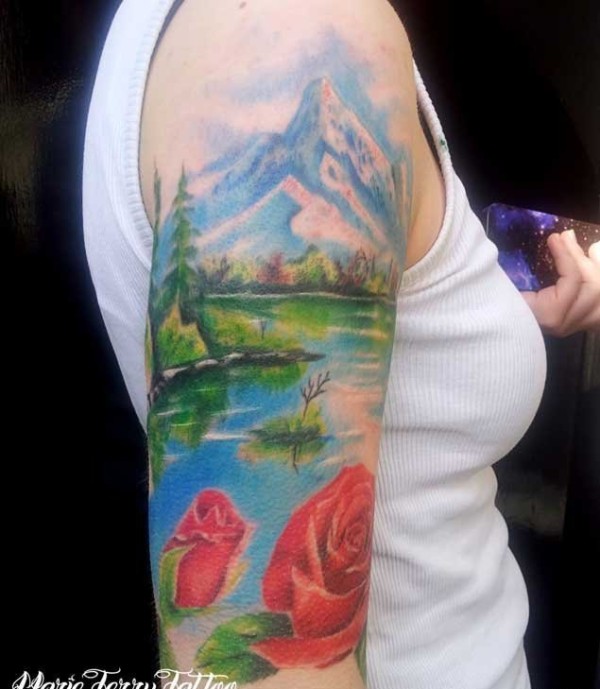 彩色的手臂山水纹身花朵纹身风景大自然植物纹身图案