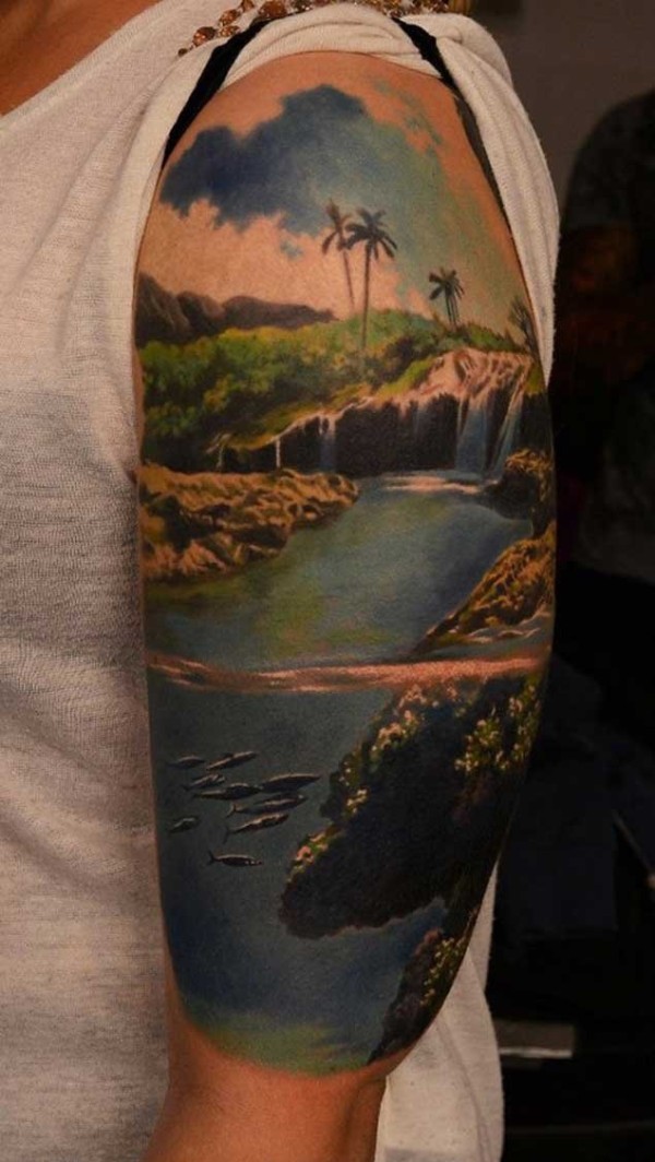 彩色的手臂山水纹身花朵纹身风景大自然植物纹身图案