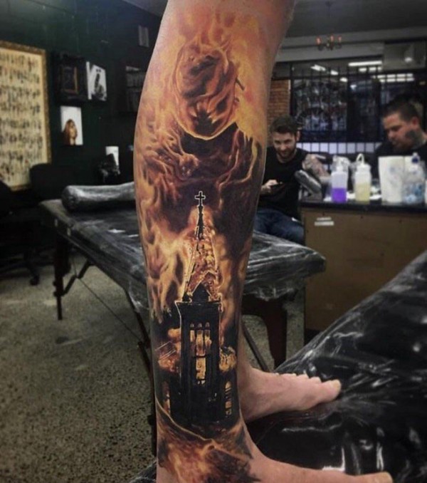 男生腿部纹身点刺技巧建筑物纹身火焰纹身图片