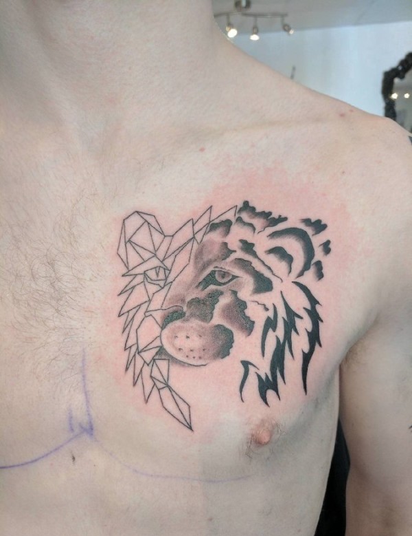 男生胸部纹身黑白灰风格点刺纹身狮子头纹身图片