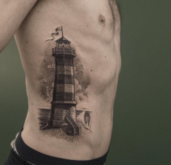 男性黑色的简易纹身素描小灯塔纹身点刺技巧纹身图案