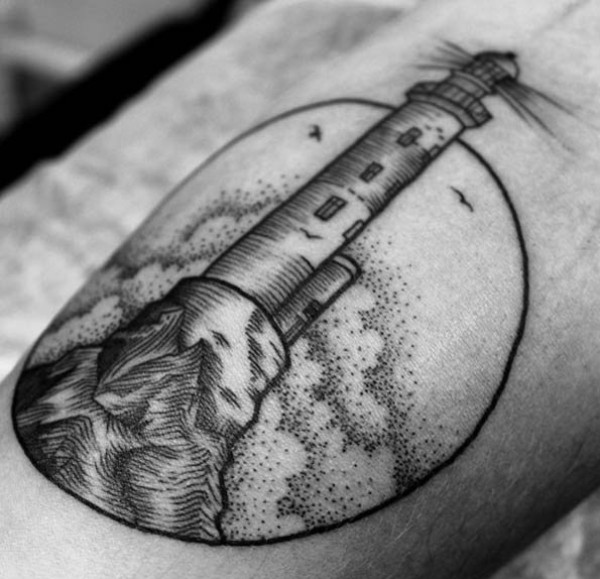 男性黑色的简易纹身素描小灯塔纹身点刺技巧纹身图案