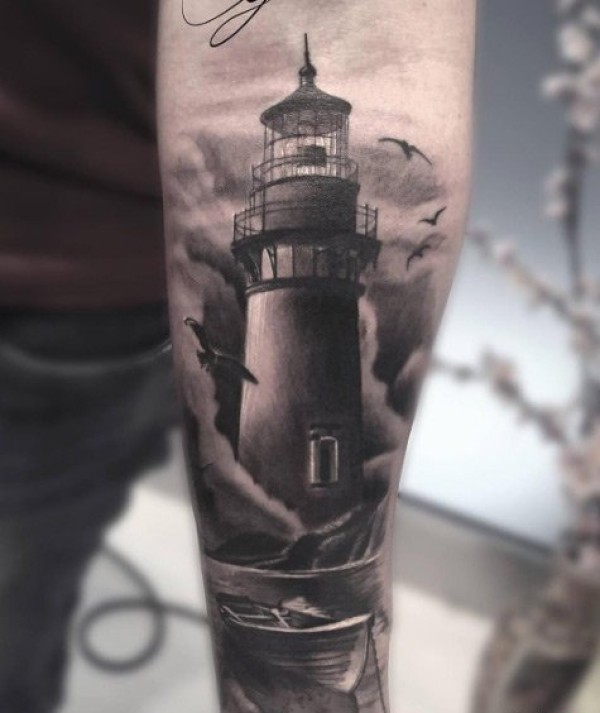 男性黑色的简易纹身素描小灯塔纹身点刺技巧纹身图案
