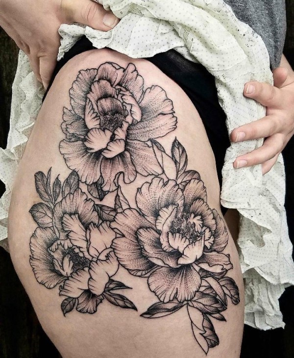 女生臀部纹身黑白灰风格点刺纹身花朵纹身图片